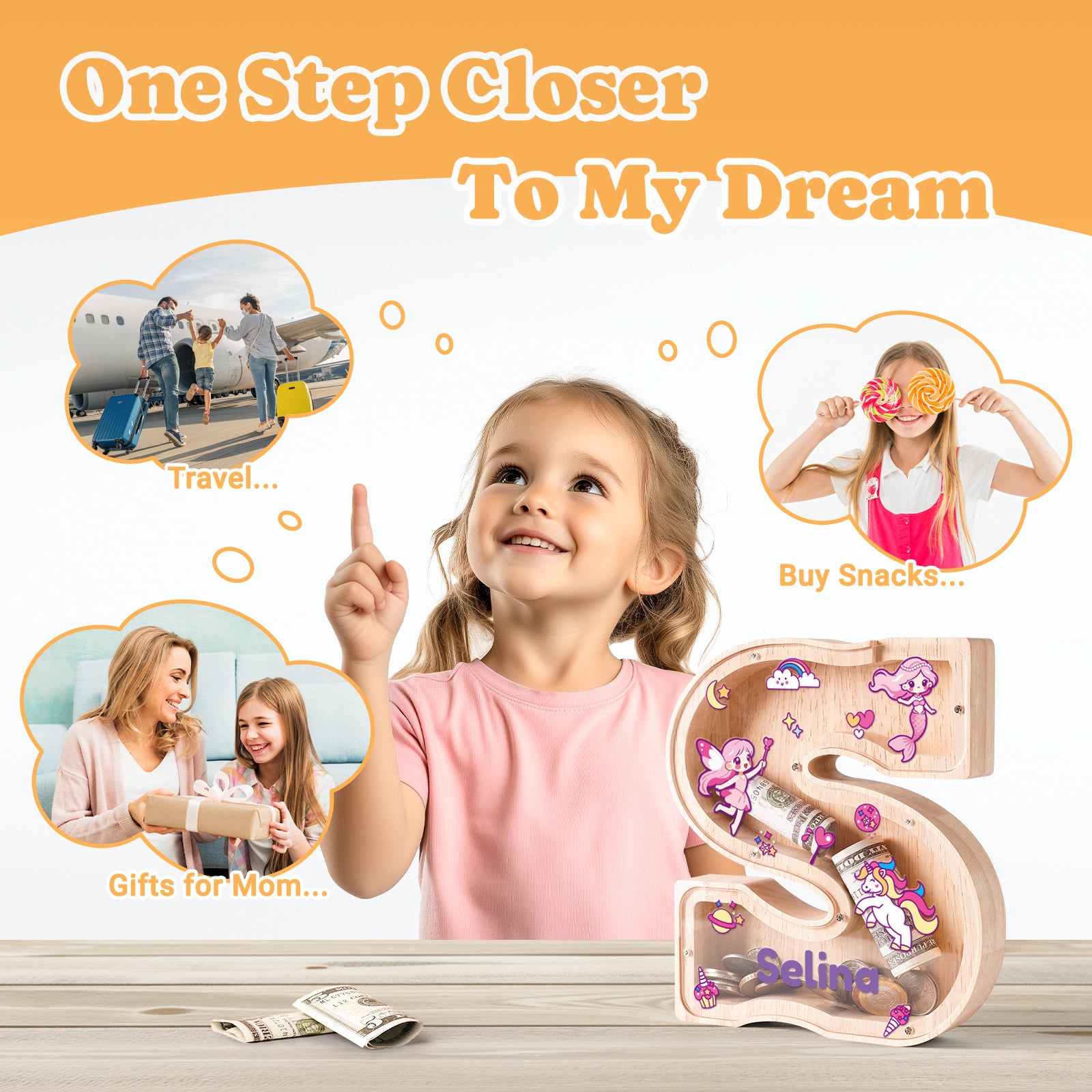 🎁【Fully Customizable Keepsake】 Personalize names + choose 4 enchanting designs (dinosaurs, space, butterflies, unicorns)! This wooden money bank is a perfect gift for both boys and girls. It's suitable for various occasions such as birthdays, back to school, Children's Day, and room decor. Beyond its functionality as a savings tool, it doubles as a delightful room decoration, adding a personal touch to any space.